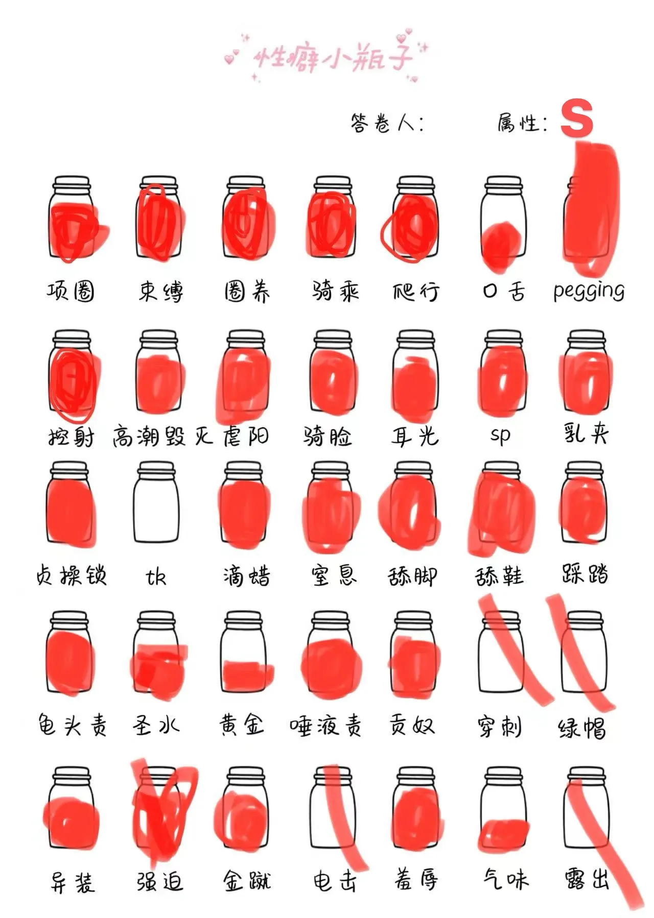 yu-e:↑怪喔,再一次感叹人和人的生理差距居然那么大。。coukou111:↑用力捏才会痛啦。我的狗浑身都是痒痒肉,乳头更是敏感地不行,稍微玩弄一下他还能靠意志力忍住,但认真玩的话就要生理性地反抗了,以至于我经常在床上被他掀翻,绑起来都没用😫yu-e:↑居然会痛?我最开始的时候乳头其实是完全不敏感的那种,就是咬都只有一点点痛的那种钝感。sdkpeter99909:↑でしょう!看到狗狗在自己的动作下做出强烈的反应,但还得乖乖顺从地被玩心里就好爽wyu-e:↑わかる!sdkpeter99909:↑hhhh是的!我有时候在公共场所也会偷偷捏狗狗的乳头,然后看他想叫又不能叫只好憋着就很开心wyu-e:↑原來是有工具跟沒工具的分別啊(筆記)sdkpeter99909:↑是这样的,不过倒推就不成立了hhh我喜欢乳首責め但会prefer直接上手,倒不如说我就是喜欢上手玩弄狗的身体yu-e:↑我就是這麼理解就塗滿的wsdkpeter99909:↑诶这么解释也不是不行,那我那一项得涂满了~yu-e:↑ん?(察覺)coukou111:↑又看了一遍小瓶子,是不是没有乳首責め?是因为这个是随手就玩起来了,所以作为日常就不算xp了吗hhh确实没有,居然少了一个我这么喜欢的项目。难道我已经阿兹海默症了……害怕w