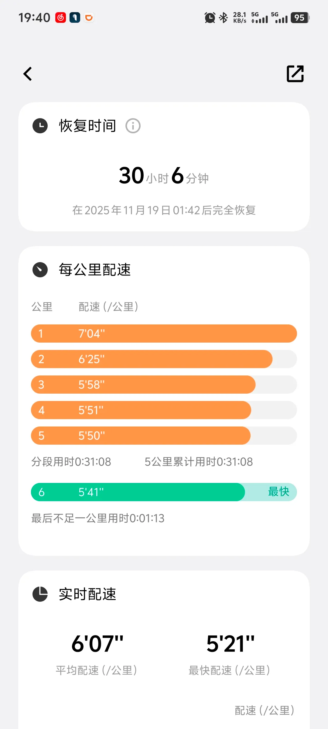 yu-e:↑感觉是今天降温的功劳hh以前完全跑不到5速,今天跑5速像散步,被5速卡了好久今天忽然突破了,爽耶😆2966202623:↑那是跑者高潮了吧wyu-e:↑以前跑都是稳定148-155之间的,大概7速左右,今天主要是完全感受不到累,就一直提速hhh这种感觉太爽了,一点累的感觉都没有像是在散步一样2966202623:↑190也太高了,心率在140-160左右比较舒服以及安全,我超过160就会减配速。其实跑步比较伤关节的,上次还看到有人跑全马结果突然脑梗偏瘫了()可怕