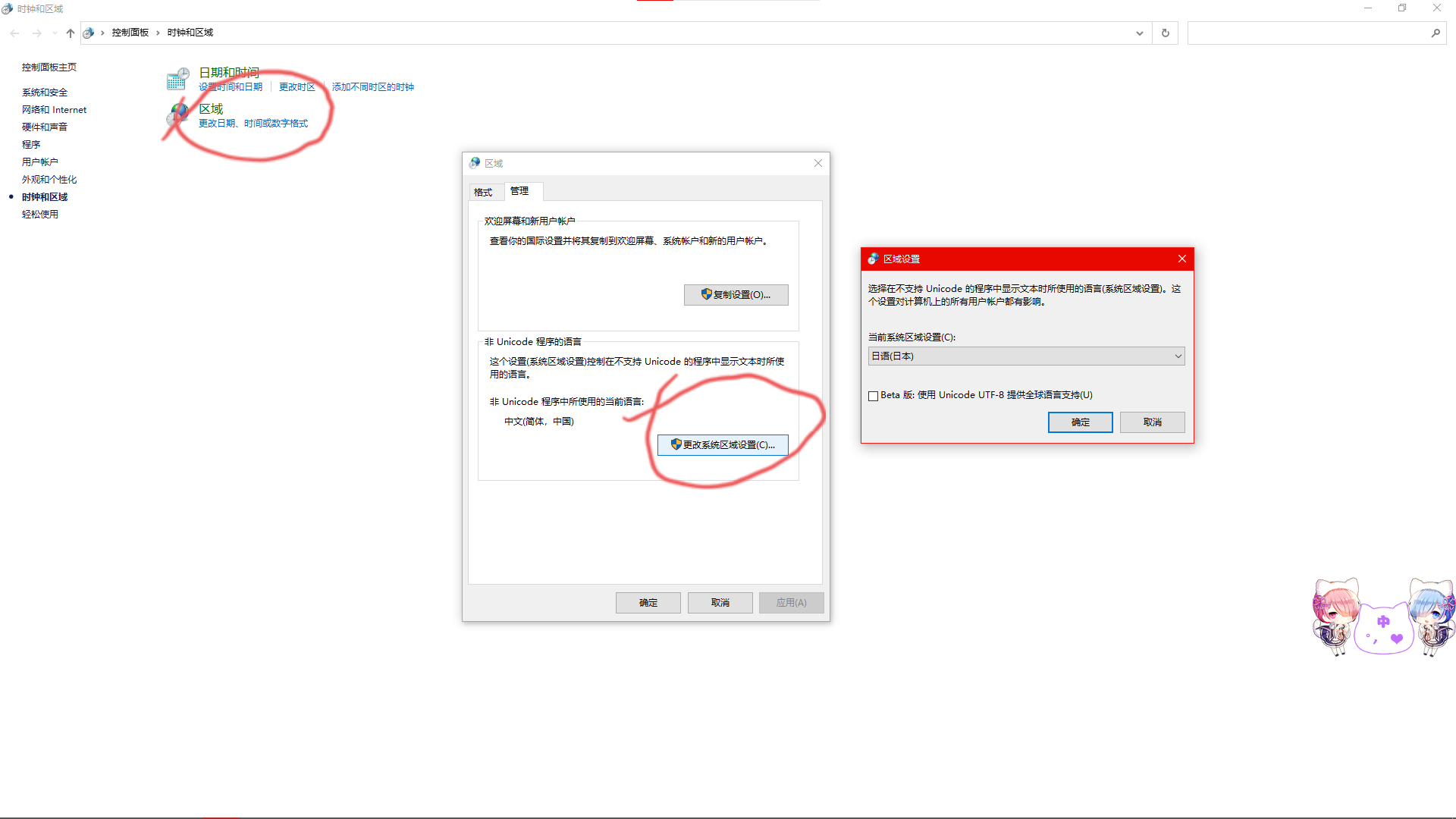 弹出窗口点”管理” 把系统区域改为“日语” 最后重启