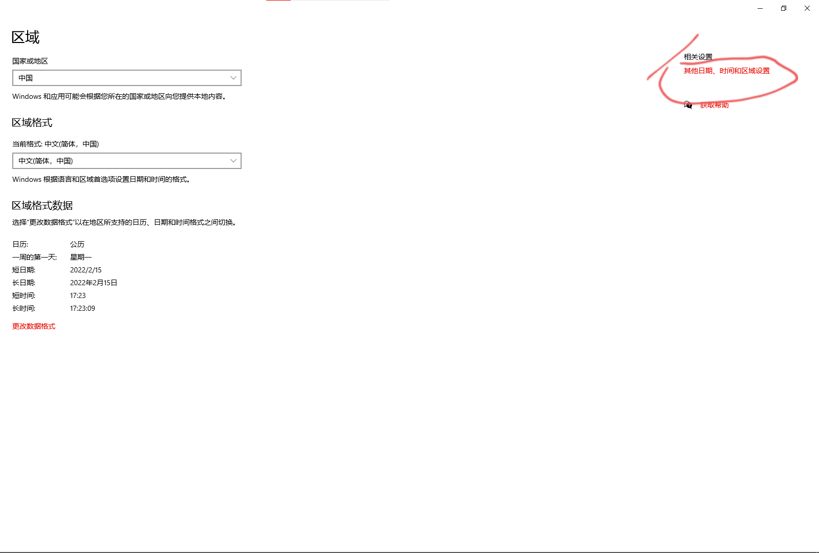 然后点“日期、时间和区域格式设置”,点击“其他日期、时间和区域设置”,接着点击“区域”。