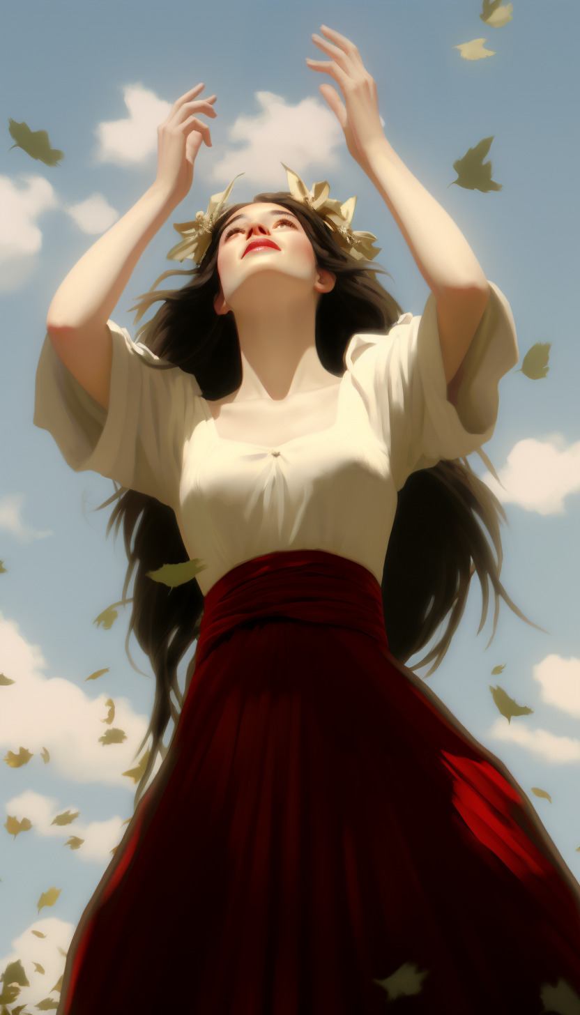 在他们恋爱一个月的纪念日,力钧特别准备了他用纹银丝手工编织的头环,他将常春藤最细腻的枝叶穿插其中,在银饰的反光下藤叶显得生机盎然。林霞非常欢喜,这次她要求自己亲自戴上。她面对着力钧靠坐在公园的石桌旁边,长裙下一条腿搭在另一条腿上,双脚刚好旋在坐在石椅子上力钧的膝前。她把所有的头发捋到了脑后,柔顺的长发顺着后背流下,她将花环用双手捧起,微扬起额头展示着她优美的颌骨曲线和光滑的脖颈,她顿了顿,随后郑重地将花环戴在自己的头上,仿佛仪式般宣告这顶头冠的所属。“我崇拜你”,力钧想说,但他觉得一丝羞耻没有说出口,他只是呆呆地望着林霞。在片刻的对视之后林霞忍不住笑了出来,她忽然踩掉自己的鞋子轻松踩上了石桌上,用右脚沿着石桌的边缘画了一个圆,然后她闭上眼睛开始舞蹈。这是一段无声的演出,只有她每次扭动她紧俏的臀部时脚底摩擦石桌的沙沙声。舞步逐渐加快,她的喘息也愈发清晰,轻快的脚步交替踩在石桌的边缘,有时她似乎整个身体将要倾倒出去,但又很快将自己拉了回来,力钧差点忍不住惊呼,但他一动不动只能惊讶地看着。眼前裙摆翻飞,有几次从他的鼻尖飞速掠过,带起一阵香甜的风。他的心被林霞的手势撩起又放下,最终双手交替爬起,放在了她的花冠两侧,她的手指伸直张开,延展出了皇冠的尖刺。舞蹈结束在了这个动作,林霞昂扬着还在起伏的胸口,慢慢睁开了眼睛。她仍然骄傲地看着前方,向着虚空炫耀着她完美的身躯,双手顺着她身体的曲线缓缓放下。良久,她才垂下目光,居高临下地注视着已经目瞪口呆的力钧,她的眼神傲慢又挑逗,勾引着力钧心底隐秘的渴望,她的头发已经散乱到了面前,几根发丝在俊美的面庞前漂浮着,但那花冠却还稳稳地正戴在她的头顶,光辉灿烂夺目。