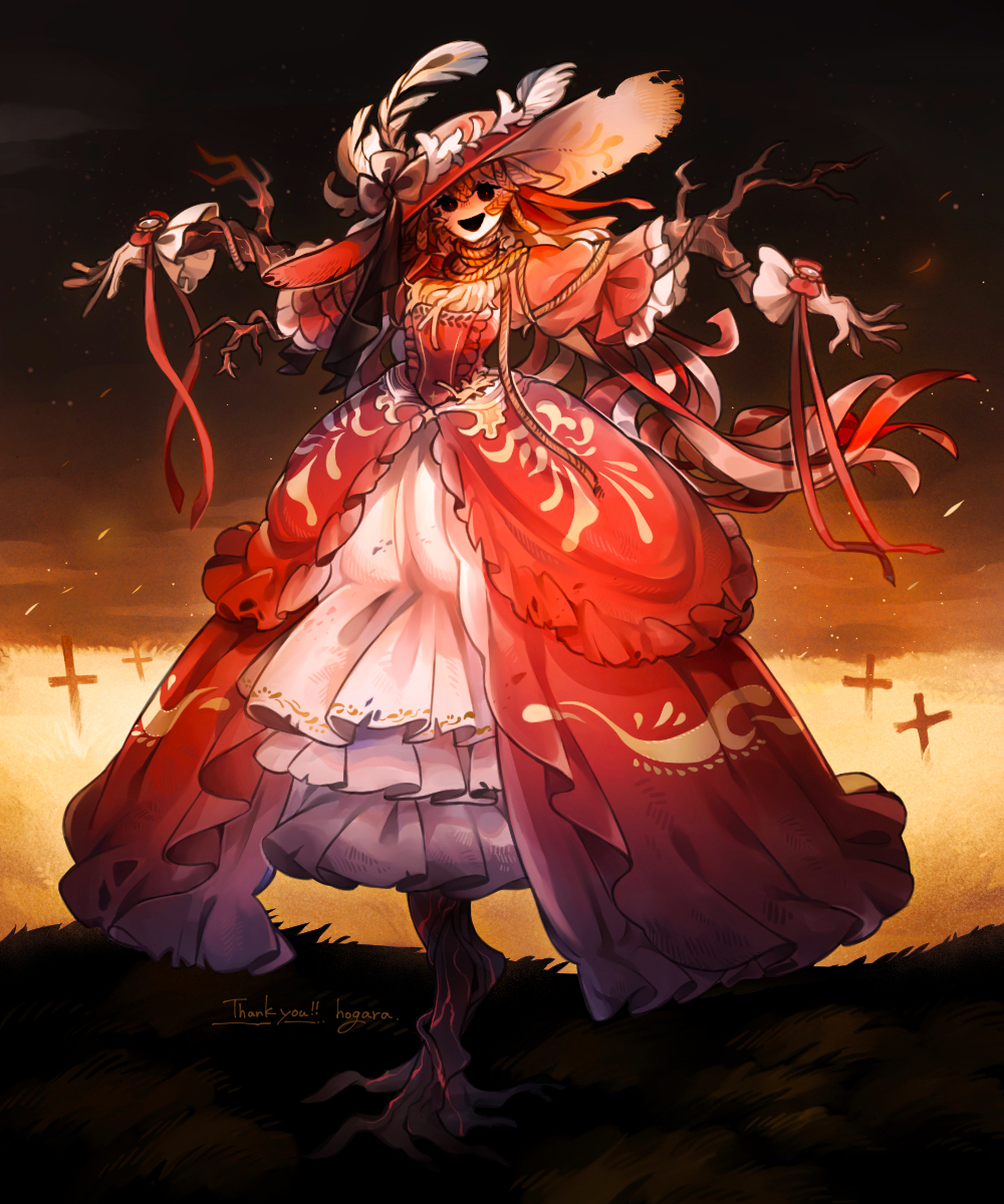 伴随一股威压降临在B组,这场游戏的胜利似乎也近在眼前了。随着A-103的降临,B组所在地方长起了及腰的稻田,金灿灿的稻田中央出现了一位高达2米的稻草人娘,她头顶一顶巨大的草帽,草帽的边缘有些破旧,上面还捆着好几片有些发黑的羽毛。她的头发由一根根麻绳组成,麻绳绕在她的脖子上好似围巾。发白的面容的一边还贴着标签,上面写着A-103,大大的眼睛内的眼球却早已不见踪影,好像被什么东西叼走了。她的四肢极其诡异,均是褐色的枯木组成。她身着一套蓬松巨大的红色连衣裙,屹立在中央,令所有人都不寒而栗。