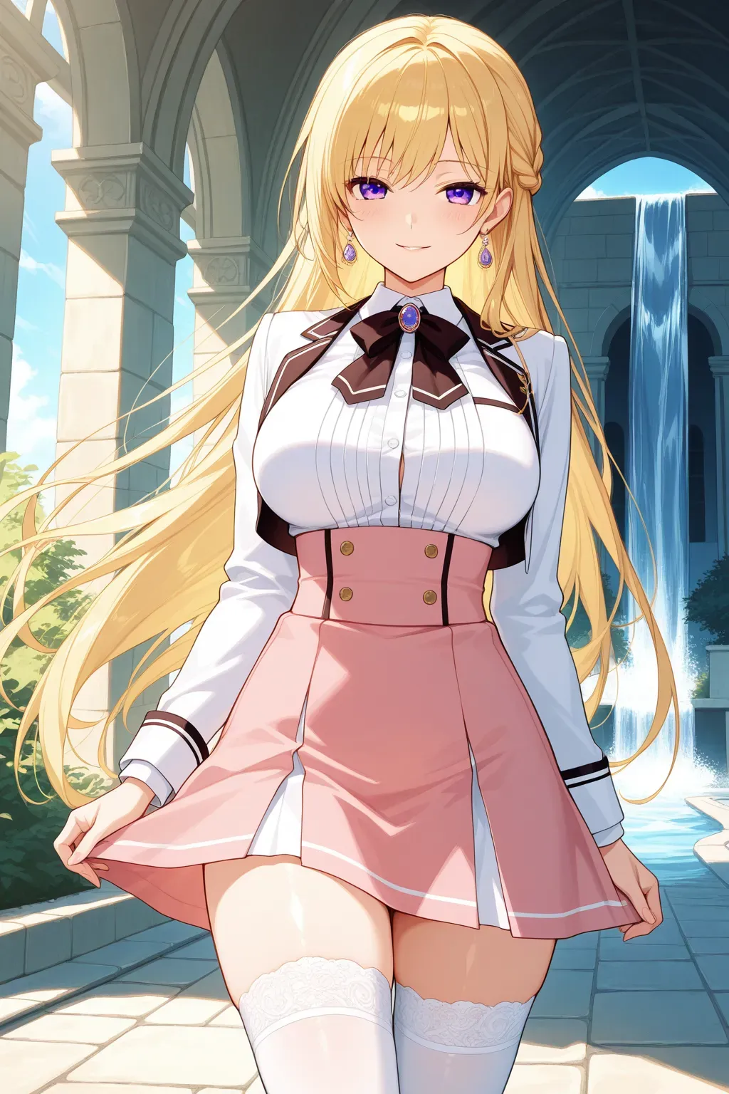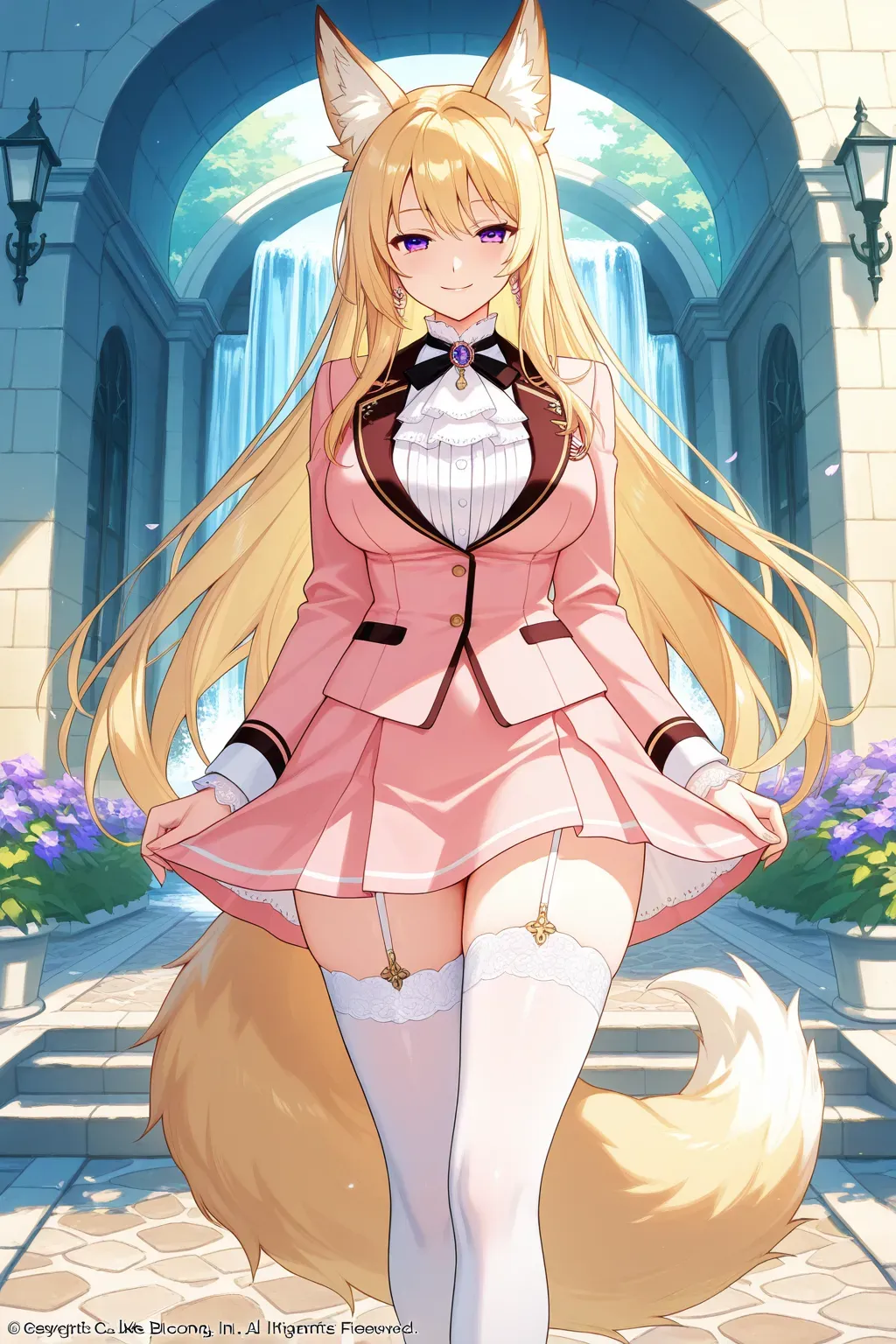 她轻轻推着林辰,让他靠在藤蔓覆盖的石墙上,粉色制服的裙摆微微晃动,露出白色丝袜包裹的修长美腿。她跪在林辰身前,淡金色长发散落,垂在她的肩头,狐狸耳朵微微颤动,尾巴甩动间散发出淡淡的魔力波动。她的纤手握住林辰的肉棒,柔软的掌心包裹着棒身,拇指轻轻揉着龟头,黏稠的前液润滑,发出“咕啾”的水声。她的樱唇凑近,粉舌舔过龟头,舌尖钻进马眼,湿滑的触感刺激得林辰低吼:【啊啊……学姐……好爽……】