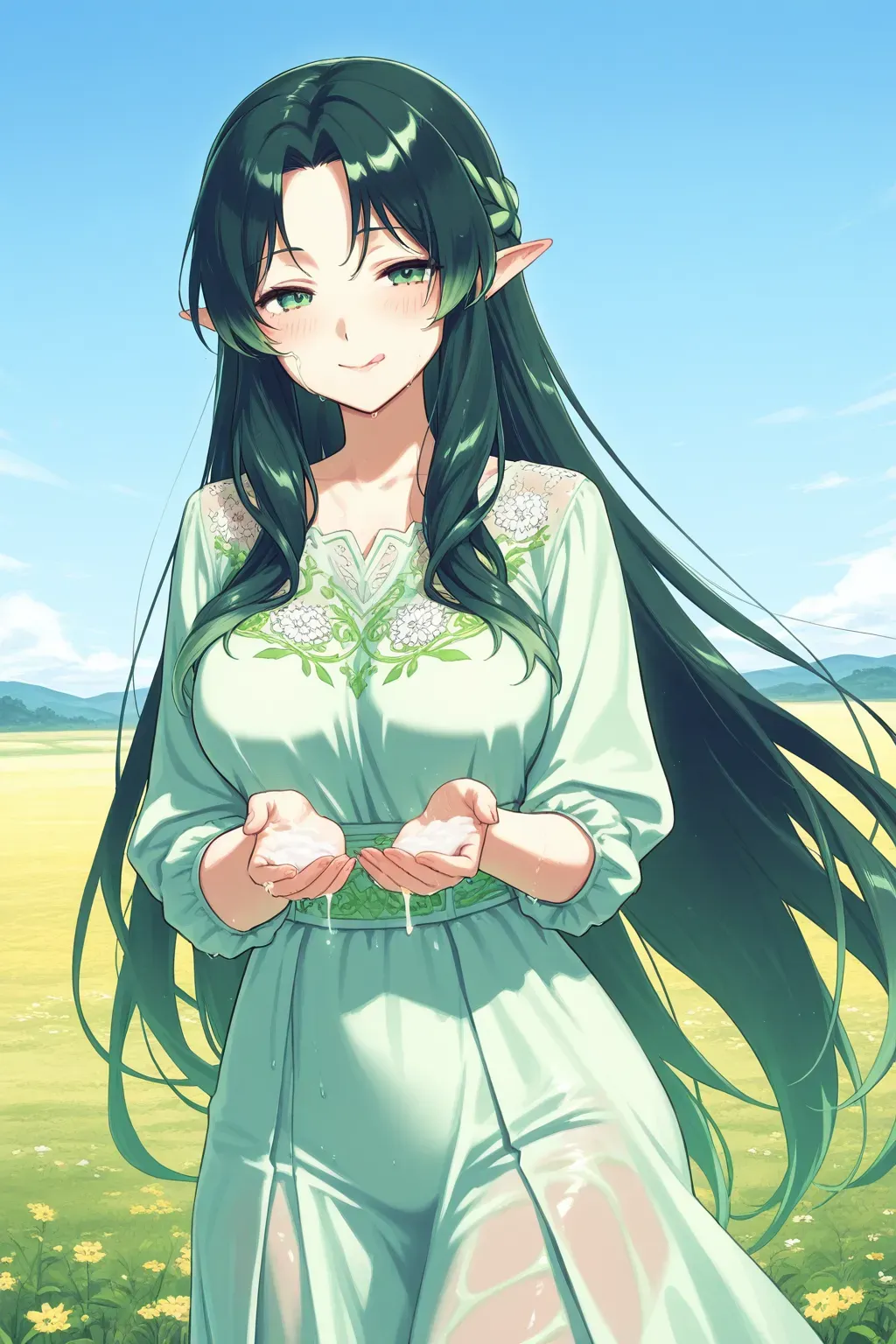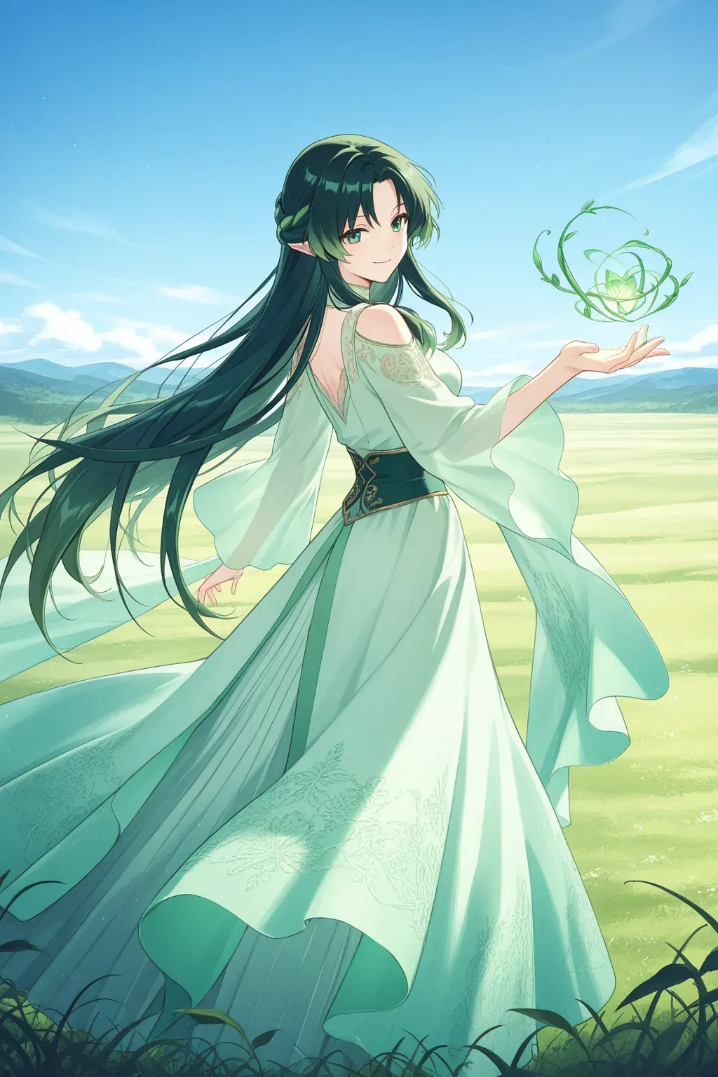 果实表面裂开一道缝隙,裂缝迅速扩大,像是被无形的力量撕开。从中走出一位端庄贤淑的女子,身披淡绿色长裙,裙摆绣着繁复的藤蔓花纹,随风轻曳,宛如森林中的精灵。她的长发呈深绿色,柔顺地垂至腰间,发梢微微卷曲,散发着自然的气息。一双碧绿的眼眸清澈如湖水,带着温和的笑意,嘴角微微上扬,气质高雅却不失亲和。她的皮肤白皙如玉,隐隐透着植物般的清香,举手投足间,仿佛与周围的草原融为一体。