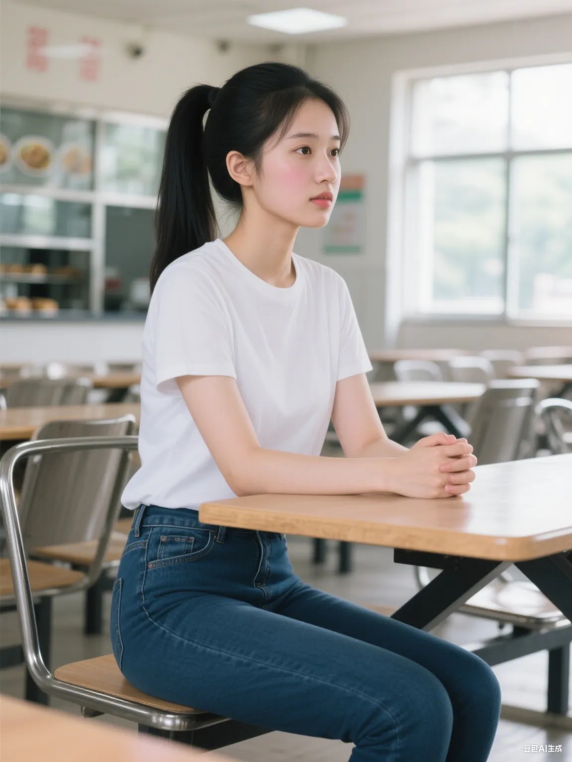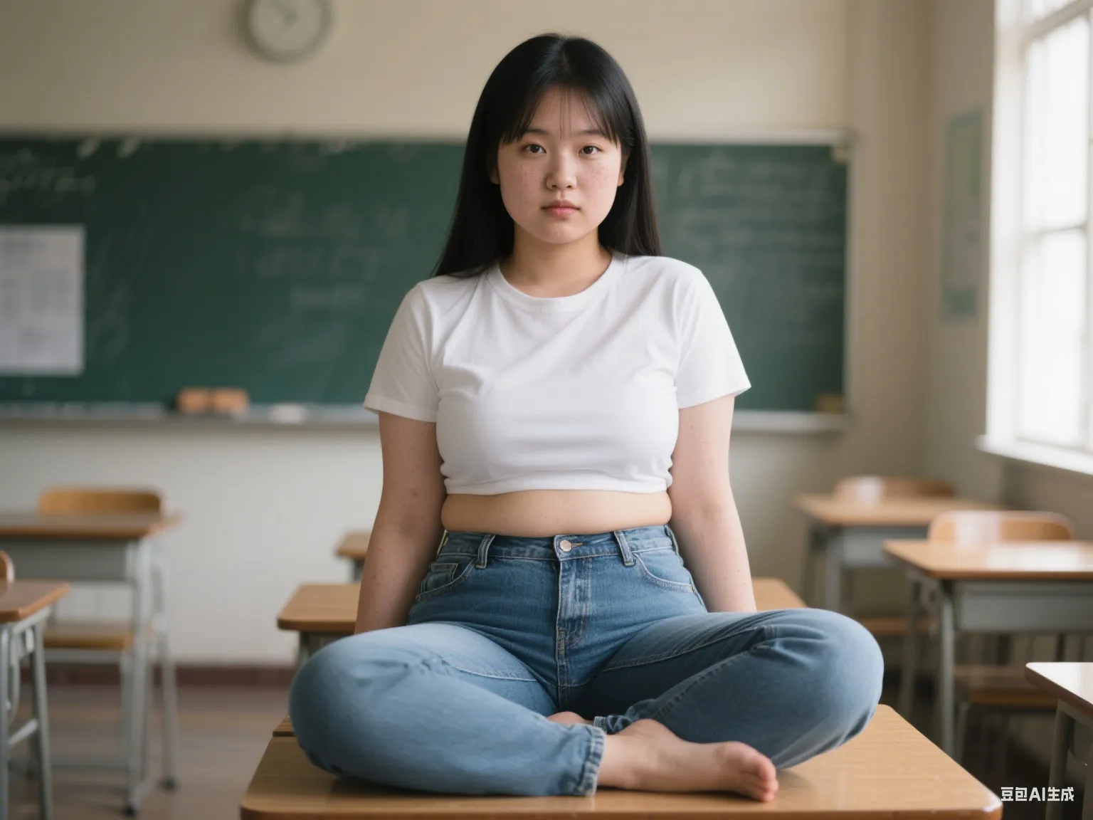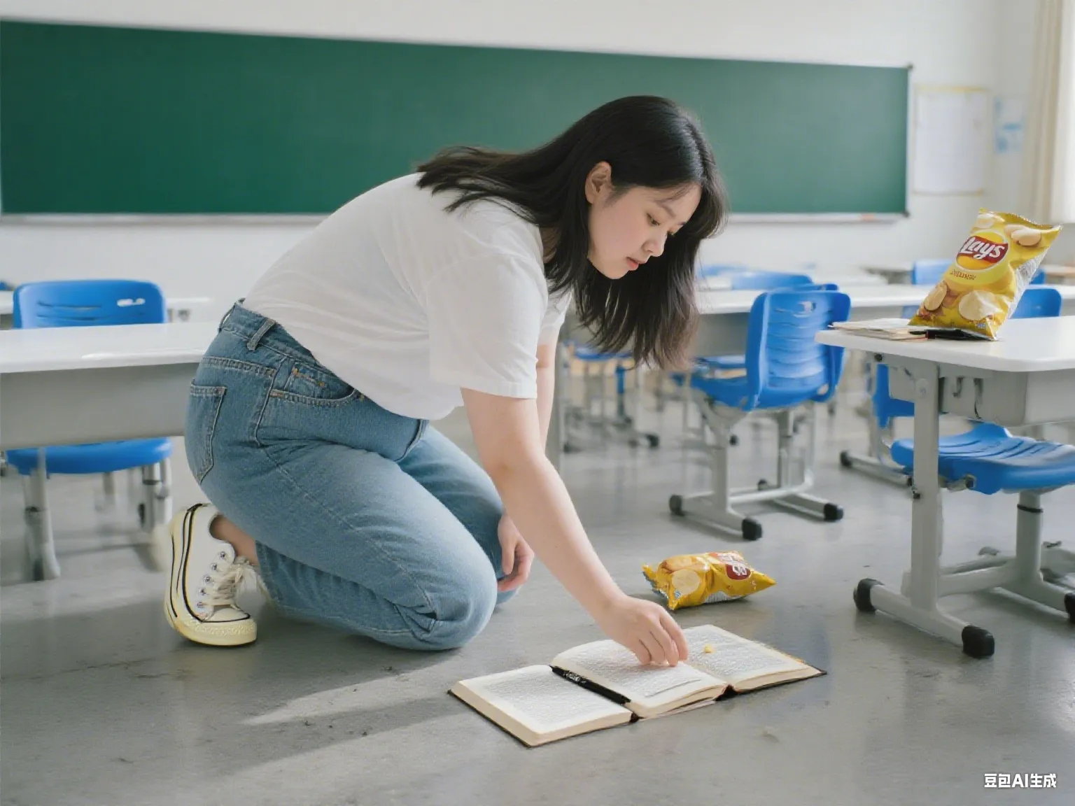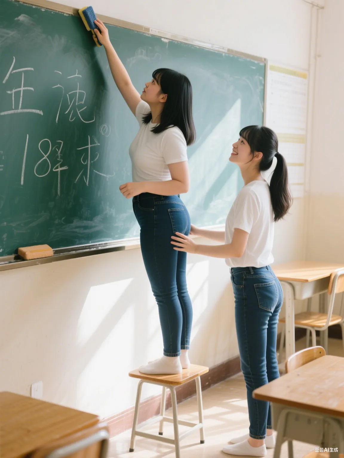 珍珍叹了口气,把薯片塞回书包,嘟囔道:“烦死了,干嘛非要管这么多……”她走到黑板前,踮起脚去擦最上面的字迹,可怎么也够不着。“哎,夏睿!”她回头,“搬张凳子过来,我上去擦。” 夏睿犹豫了一下,还是搬了张椅子放在讲台边。珍珍踩上去,背对着她,双手举着板擦用力擦拭。她的牛仔裤紧紧包裹着臀部,随着动作微微起伏,像两团柔软而有力的肉丘在晃动。突然——“噗……噗噗。”