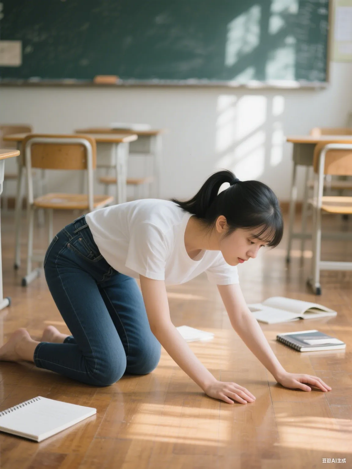 教室的长窗透进一束偏暖的光,把地板切成深浅两色,尘埃在光缝里缓慢翻涌,像细小的生物在呼吸。几排桌椅静静地立着,桌面泛着微微的旧漆光,仿佛连空气都在等待什么才会重新流动。粉笔灰在空气中浮游,黑板上还残留着白天未擦净的字迹,空气中弥漫着粉笔末、旧书页和一丝若有若无的汗味。夏睿站在讲台边,手里握着一块湿抹布,指尖微微发凉。她刚把最后一排的课桌摆整齐,转身时却发现珍珍正大剌剌地坐在第一排的椅子上,翘着二郎腿,脚尖晃来晃去,嘴里还哼着不成调的流行歌。