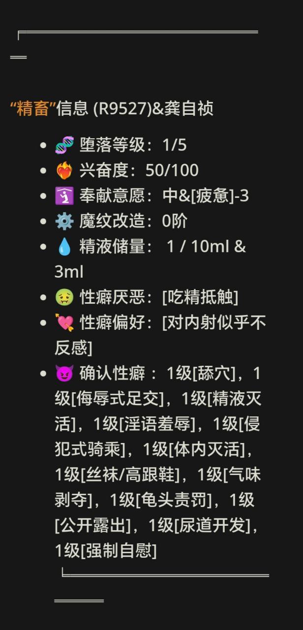 - 😈 确认性癖 :1级[舔穴],1级[侮辱式足交],1级[精液灭活],1级[淫语羞辱],1级[侵犯式骑乘],1级[体内灭活],1级[丝袜/高跟鞋]