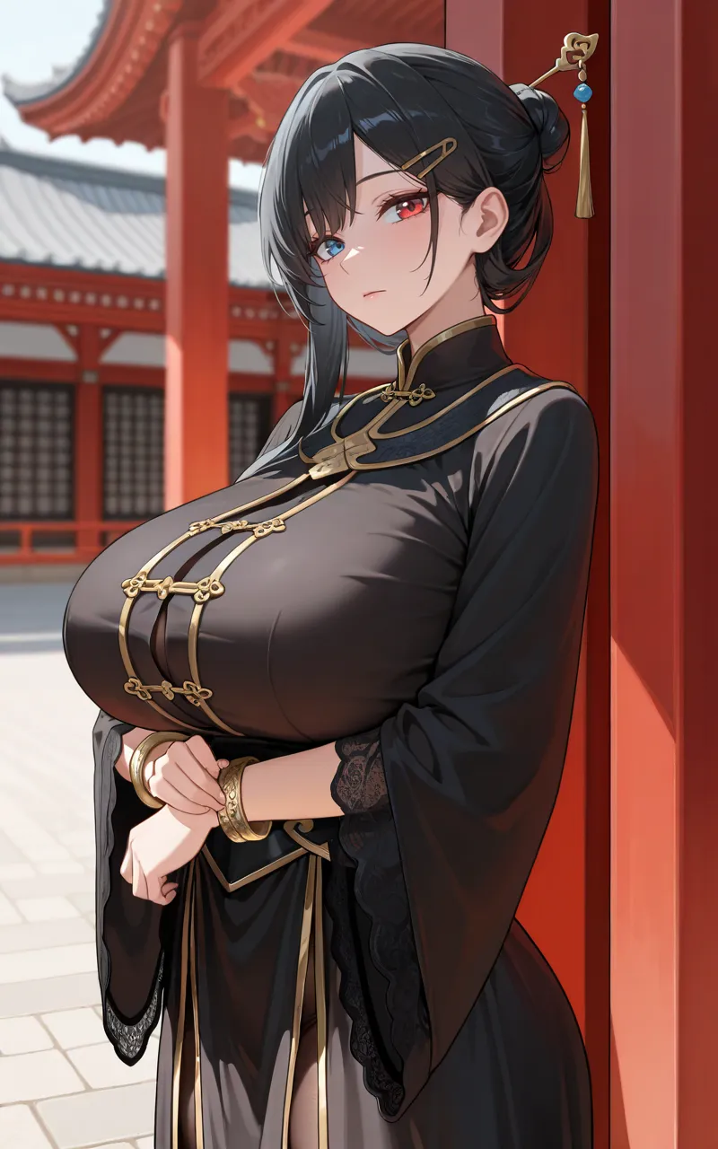 一位气质高雅的黑发女子,靠在身后的柱子上,乌黑的发丝高高盘起,发型端庄却透着几分妖冶,顶端插着一支金光闪闪的发簪,簪子装饰着天蓝色的宝石,垂下的流苏随着她的轻微动作轻轻摇曳,发出细微的碰撞声,她的眼睛是极为少见的异色瞳,赤色眼睛深邃如血,蓝色眼睛静如止水,光从眼睛就能看出女子实力深不可测,嘴角也如同现在的表情一样僵硬,光是看脸就能感受到时刻散发出身为长辈的威严,不怒自威大概也是如此
