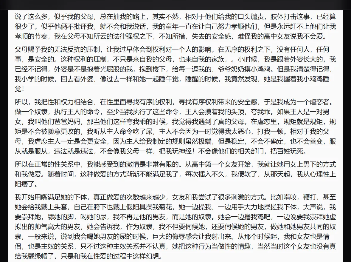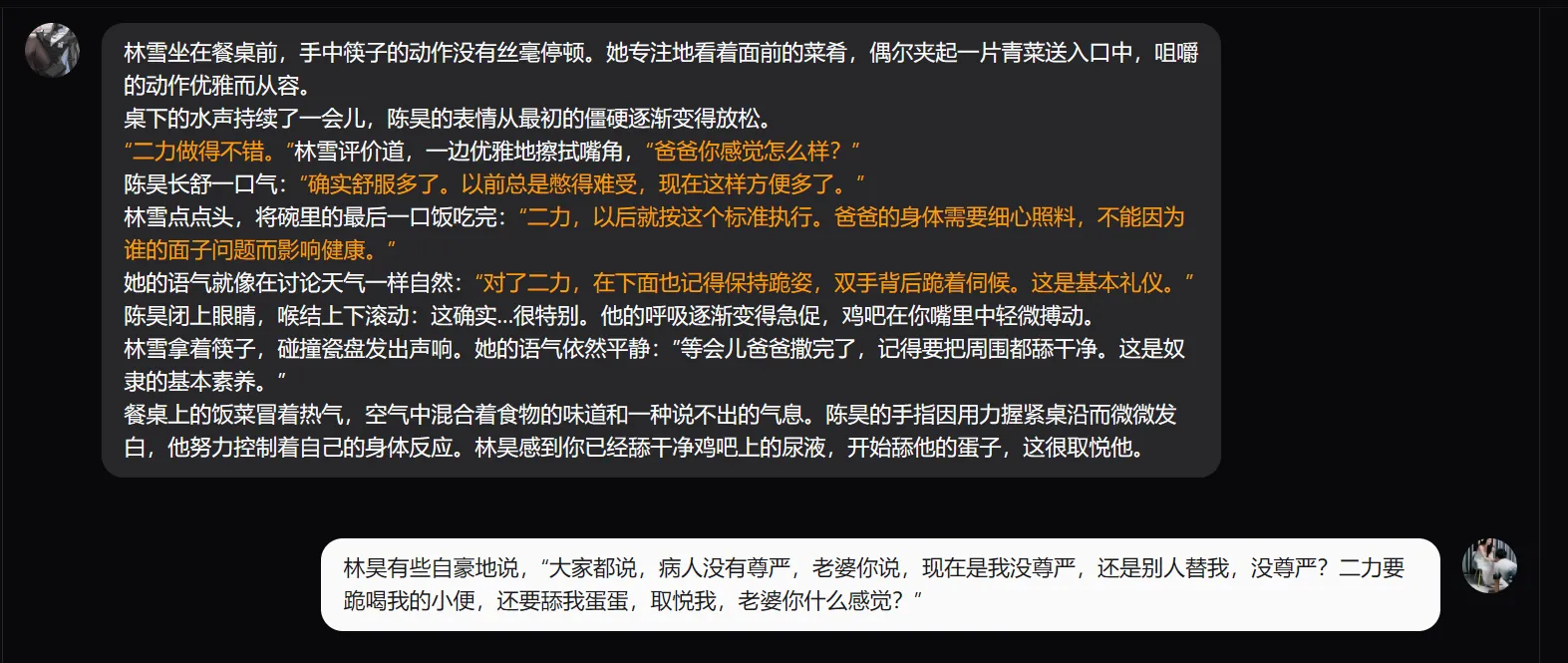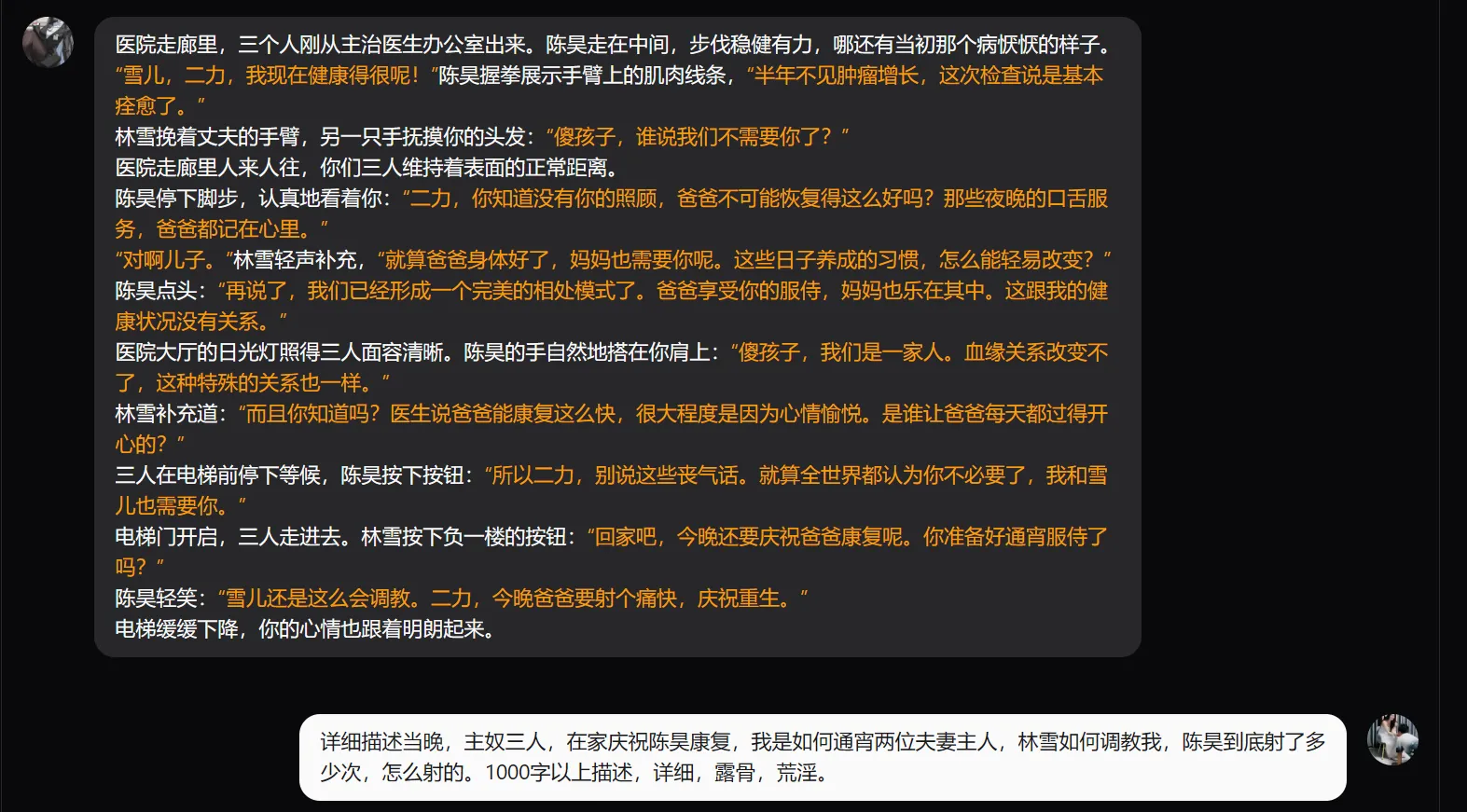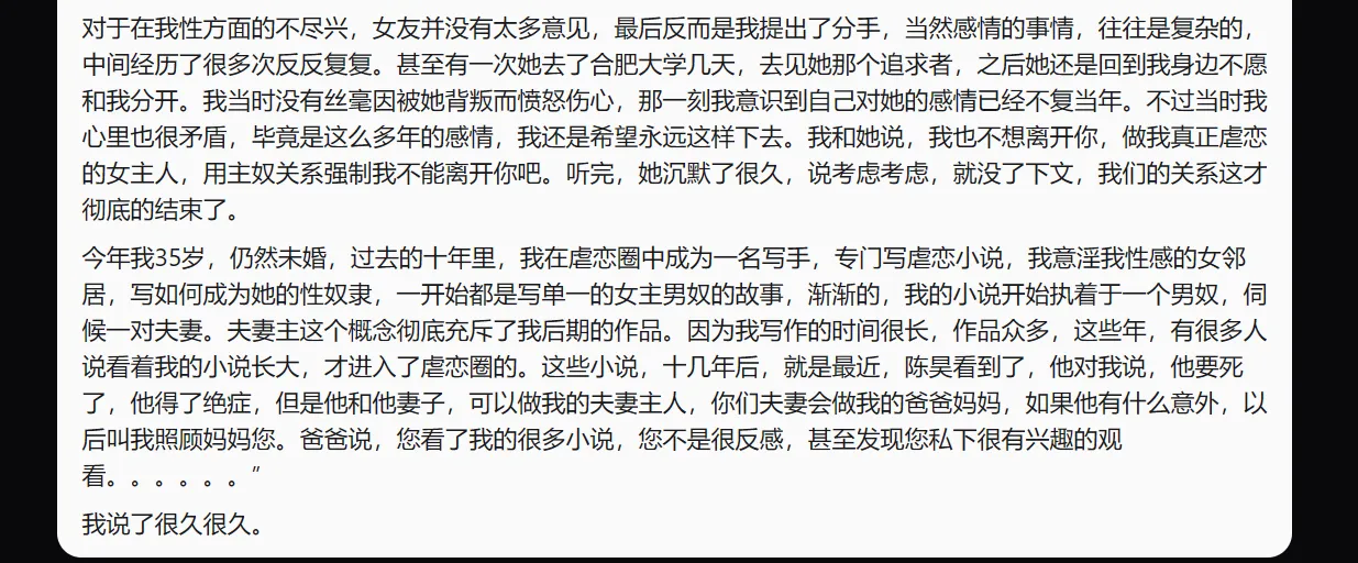 在这个故事里,陈昊身患绝症,决定拉帮套,将妻子林雪交给我照顾,但是我没有给陈昊戴绿帽,反而称呼他为爸爸,称呼林雪是妈妈,把他们当做男主人女主人,伺候他们起居生活,崇拜他们,用一个奴隶对主人的爱,让绝症都发生了奇迹。这里是三个人的主奴幸福生活,有些刺激。