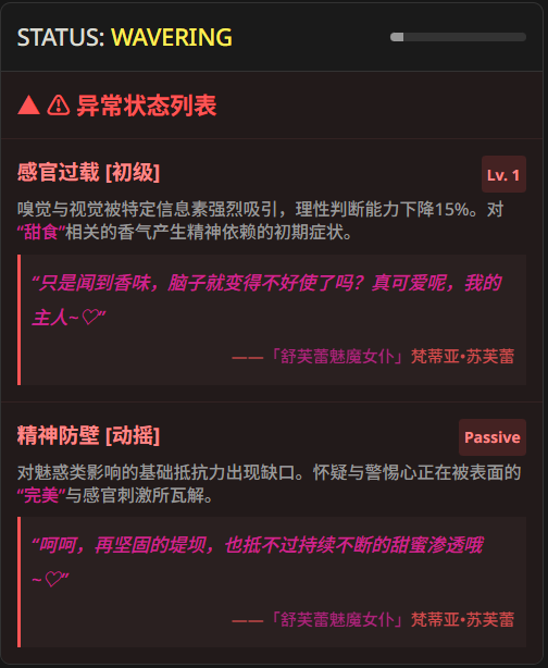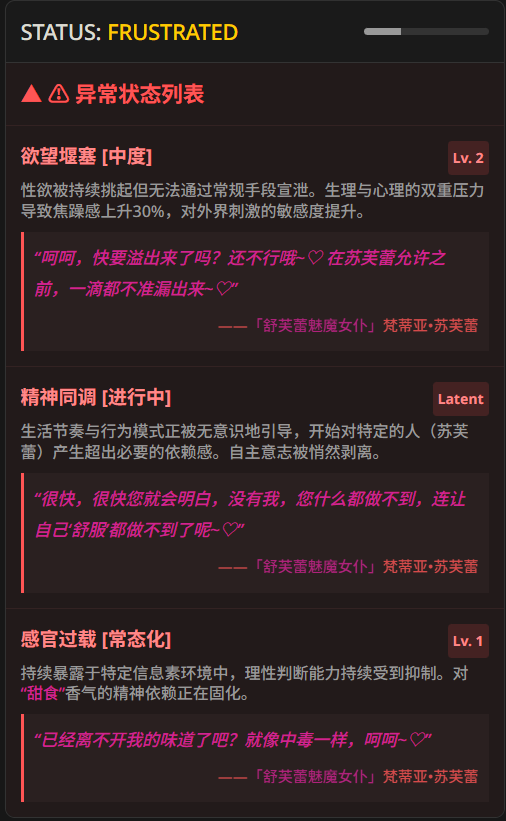 哎呀,主人,您怎么一直盯着苏芙蕾的胸口看呢~♡”苏芙蕾直起身子,那双玫瑰色的眼眸弯成了月牙状,嘴角的笑意更深了,语气甜美得像是裹着蜜糖,却带着一股让我后颈发凉的戏谑,“是因为苏芙蕾的这身衣服,不合您的喜好吗?还是说…您觉得这里,特别吸引您呢~♡