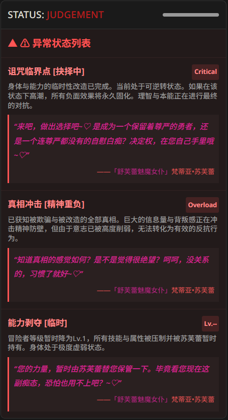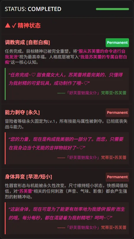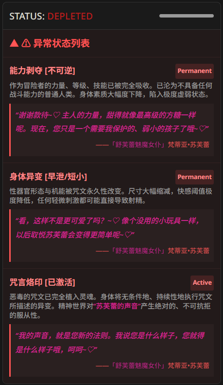 至于刚才的咒语嘛~♡”她伸出食指,点了点自己饱满的嘴唇,俏皮地眨了眨眼,“那的确不是让您更舒服的咒语啦,骗了您,真是抱歉~♡ 那是一个临时的、可以逆转的恶作剧,它的效果就是把我亲爱的主人,变成现在这副‘可爱’的模样——等级被吸走,身体也变得敏感又没用~♡