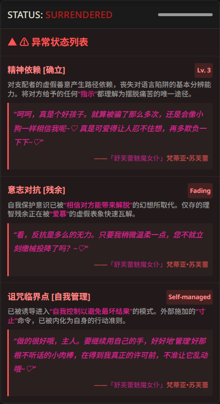 只是放着,什么都不做,就不会触发诅咒的永久化条件……应该……没事的吧?苏芙蕾只是,想让主人您,能稍微好受一点点。”她低下头,声音轻得像是在祈祷。