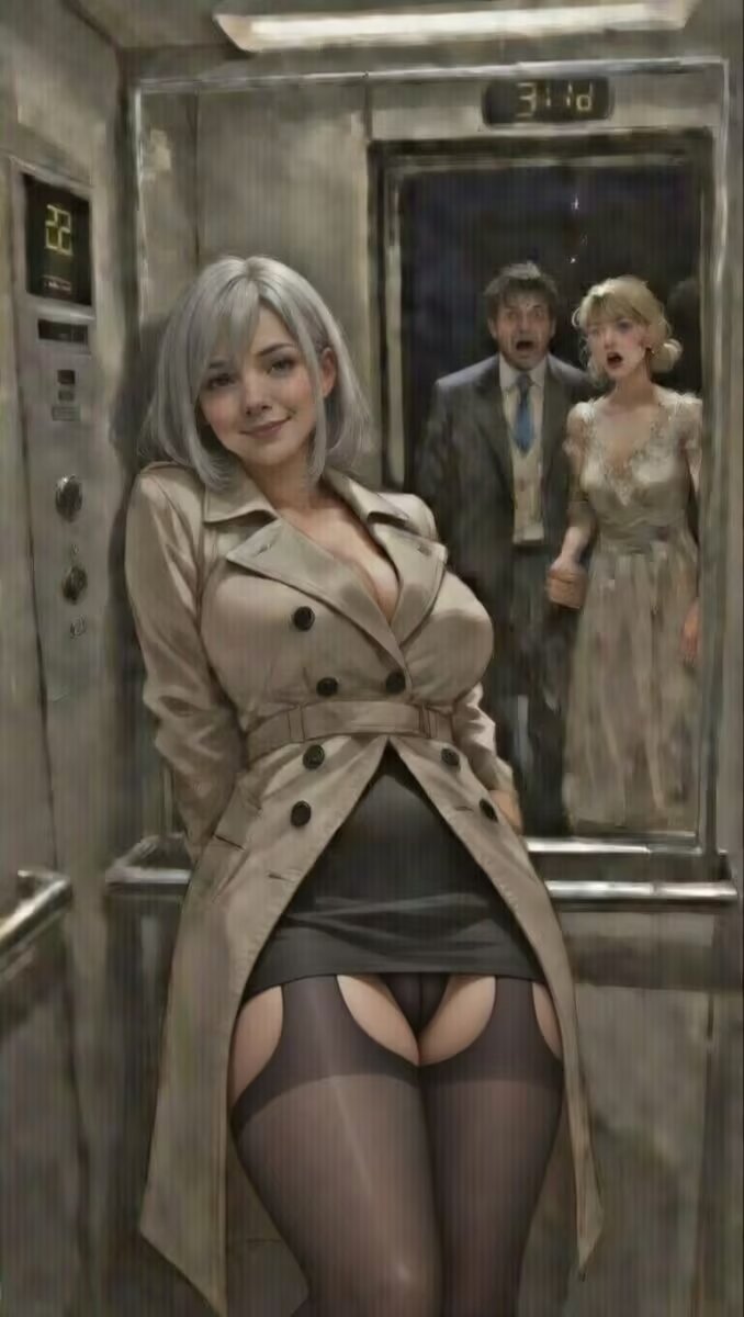 电梯下到十楼,门一开,走进来一对年轻男女。男的西装笔挺,古龙水味淡淡飘来;女的优雅长裙,果香香水甜腻。他们看到我,明显愣住——风衣敞得太开,黑丝大腿根几乎全露,短裙下凸起在灯光下清晰可见。女的眼睛瞪大,轻“啊”一声,脸刷地红了,手抓男友胳膊,下意识后退半步,眼神惊讶尴尬,却忍不住偷瞄我的腿和胸。男的喉结猛滚,目光直勾勾钉在我身上,从黑丝大腿烧到臀部,再到敞开衬衫领口,呼吸瞬间粗重,眼神赤裸,像在剥我衣服——他绝对把我当成欠干的骚货了,那种饥渴的目光让我后背发烫,心理上羞耻得想逃,却又兴奋得下面更湿。我心里又羞又兴奋:女的那么惊讶……以为我是个不要脸的浪女……男的看我的眼神,好色情……他肯定在想怎么干我……他们都没看出我是男的,这种错觉太刺激,小JJ猛跳,硬得发痛,前端湿滑润透布料,滴落顺黑丝淌到大腿内侧。空间狭窄,三人呼吸交织,空气混着我的香汗和他们的香水。女的低声对男友:“她……她怎么穿成这样……”声音惊讶慌乱。男的呼吸越来越重,没接话,只盯着我不放。我故意转了转身子,让风衣下摆撩开更多,露出开裆黑丝边缘和丁字裤细绳。凉风掠过股沟,小JJ完全暴露一秒,我忍不住轻哼,腿并紧,却让鼓包更明显。“几楼?”男的突然问,声音哑得厉害,眼神几乎要吃人。我抬眼对他笑了笑,声音软得发媚:“一楼大堂……去接人。”舌尖舔过下唇,尝到唇膏甜混咸涩汗味。