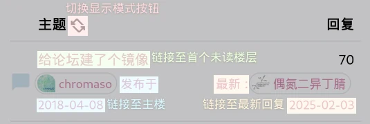 - 此前在主题列表页中,每个主题的标题本身总是链接至主楼。现在,标题本身将链接至你之前已读的最新楼层之后(接下来就可以直接阅读你未读过的楼层);点击「发布于」或对应的日期,将跳转到主楼;点击「最新:」或对应的日期,依然会跳转至最新楼层。