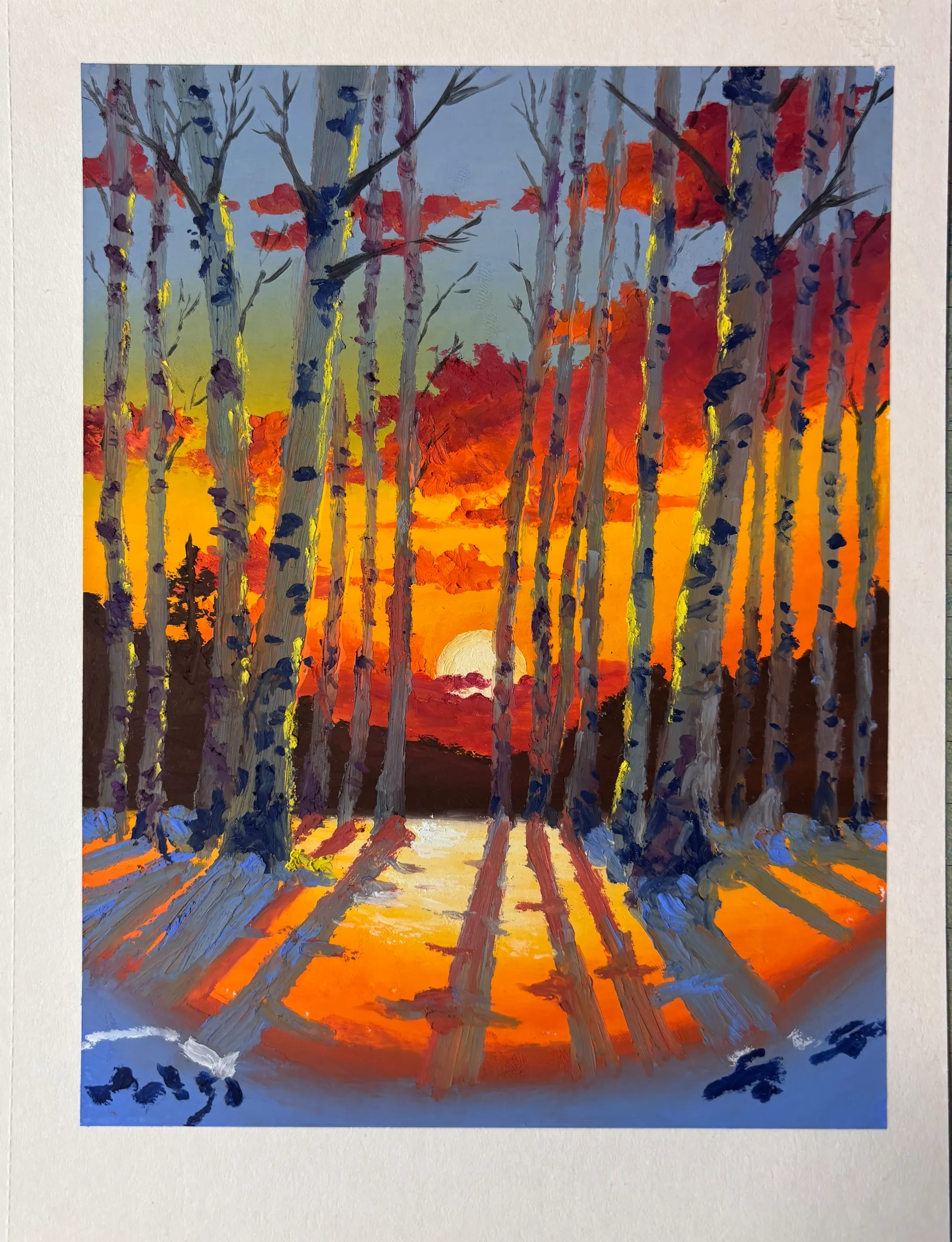我端详着它,画的是某一年的冬天崇礼的小树林,夕阳落在山后,橙红的光铺满了整片天空,白桦树的影子被拉得很长,一道道印在粉蓝色的雪地上。那天很冷,起草稿的时候手指冻得发僵,每画几笔就要捏紧拳头,再呵一口热气。