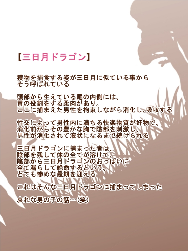 被三日月龙捕获的人,阴部以外的身体将彻底融化,把一切从阴部泄漏至三日月龙的乳房而死,迎来极其悲惨的结局。